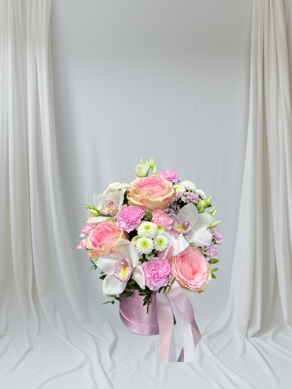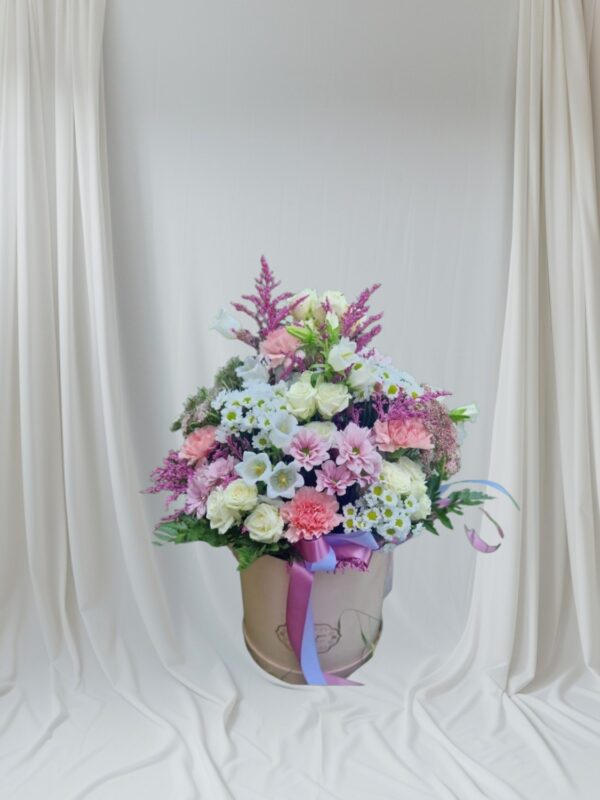 Subtelny flowerbox utrzymany w pastelowych odcieniach różu, bieli i jasnej zieleni, który zachwyca lekkością oraz naturalną elegancją. Box składa się z margaretek, gałązkowych różyczek, goździków, dzwonka karpackiego oraz drobnych kwiatowych dodatków. Delikatne kwiaty tworzą harmonijną formę, pełną świeżości i wdzięku. Kompozycja została starannie wyważona, dzięki czemu emanuje spokojem i romantycznym nastrojem. Ozdobna wstążka i jasne pudełko dodaje całości uroku i podkreśla jej wyjątkowy charakter. To doskonały wybór na urodziny, imieniny, podziękowanie lub jako piękny gest bez okazji.