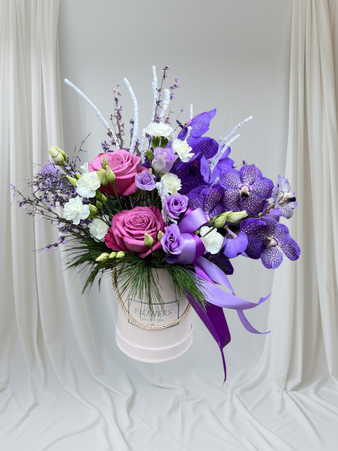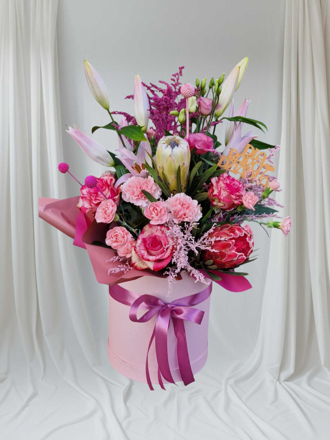Romantyczny flowerbox w jasnych, pastelowych barwach, łączący kremowe lilie, delikatne róże, goździki. Kompozycja wzbogacona o świeżą zieleń i lekkie, dekoracyjne elementy zachwyca harmonią oraz naturalną lekkością. Intensywnie różowe pudełko nadaje całości nowoczesnego, a jednocześnie kobiecego charakteru. Idealny wybór na urodziny, Dzień Kobiet, baby shower lub jako elegancki prezent pełen ciepłych emocji.