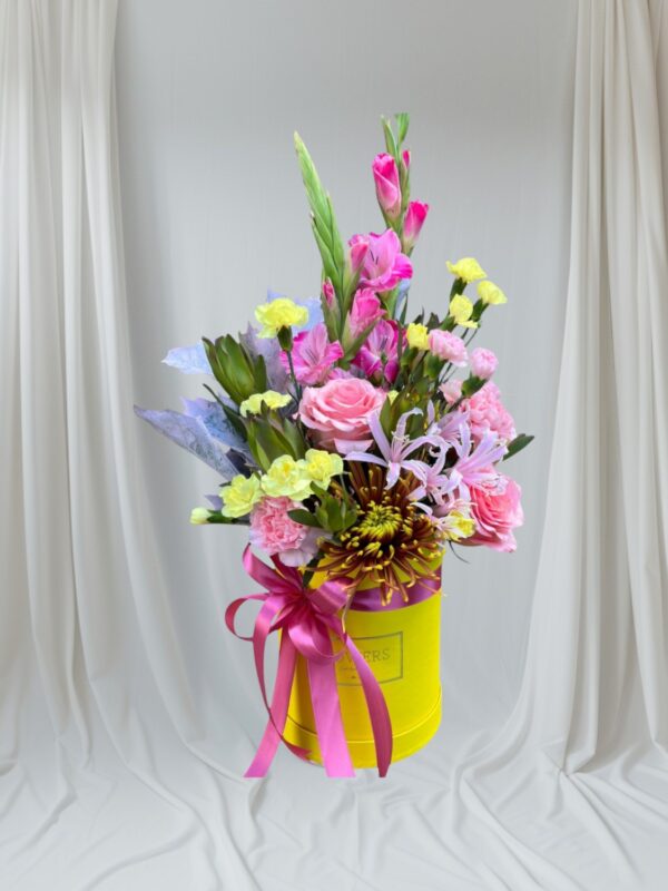 Radosna i pełna energii kompozycja, która zachwyca połączeniem soczystej żółci, delikatnego różu i świeżych, wiosennych akcentów. Róże, goździki, mieczyki oraz dekoracyjne kwiaty sezonowe tworzą dynamiczną, lekką aranżacje. Intensywnie żółte pudełko oraz różowa wstążka podkreślają pogodny charakter flowerboxa i sprawiają, że całość emanuje pozytywną energią.