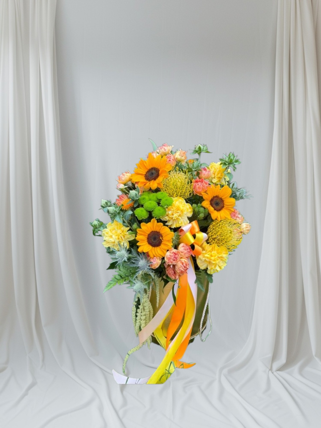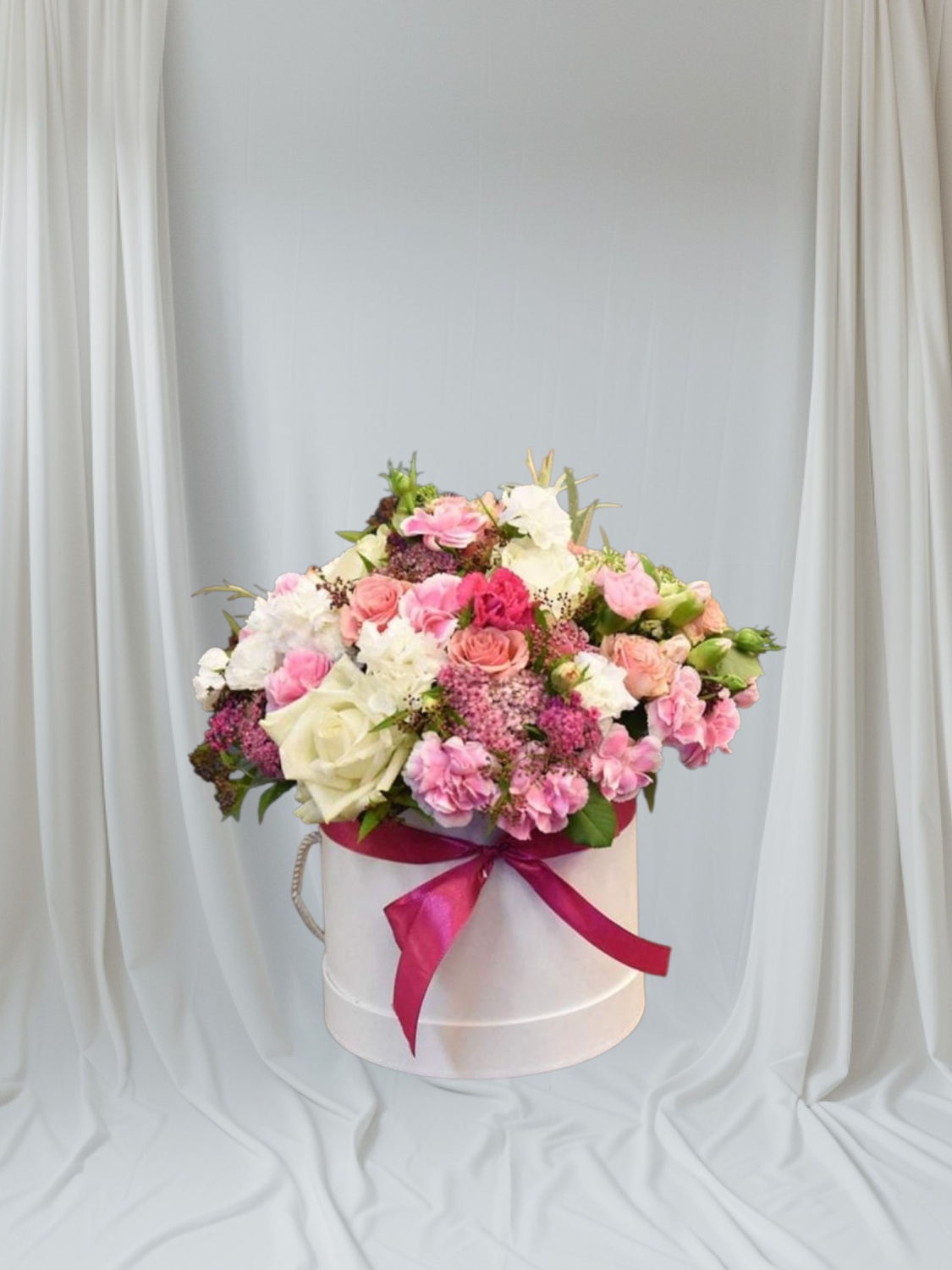 Subtelna, romantyczna kompozycja w delikatnych odcieniach różu, kremu i bieli. Flowerbox wypełniony jest różami, hortensją, goździkami oraz drobnymi kwiatami sezonowymi, tworząc miękką, harmonijną całość. Eleganckie jasne pudełko z bordową wstążką dodaje klasy i podkreśla wyjątkowy charakter aranżacji. Idealny prezent na urodziny, imieniny lub jako wyraz czułości.