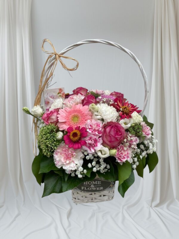 Ten kosz to esencja subtelnej elegancji i romantycznego nastroju. Starannie dobrane kwiaty w odcieniach pudrowego różu i kremowej bieli tworzą harmonijną, niezwykle lekką kompozycję. Róże symbolizujące czułość i wdzięczność pięknie łączą się z goździkami, gerberami oraz drobnymi kwiatami wypełniającymi, które dodają całości harmonii. Zielone liście stanowią naturalne tło, podkreślając świeżość aranżacji. To idealny wybór na urodziny, imieniny, podziękowanie lub jako elegancki gest pełen serdeczności.