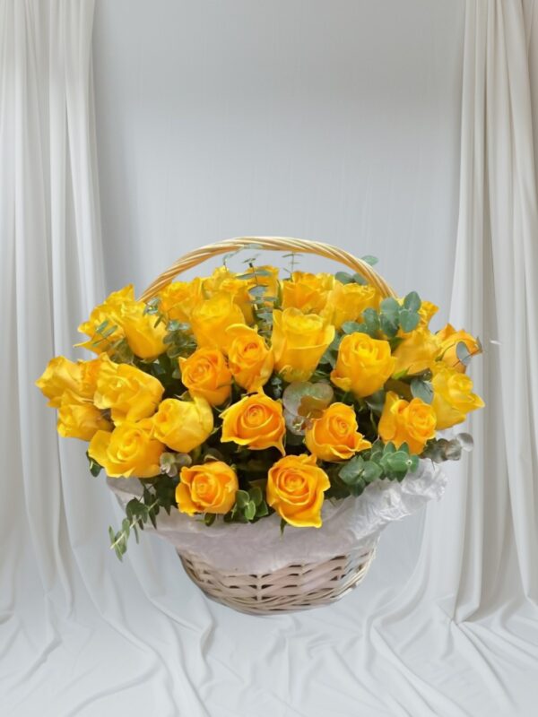 Ten wyjątkowy kosz kwiatowy zachwyca bogactwem intensywnie żółtych róż, które od wieków symbolizują radość, optymizm i ciepłe uczucia. Starannie dobrane, świeże kwiaty zostały ułożone w klasycznym wiklinowym koszu, który podkreśla naturalny i elegancki charakter kompozycji. Całość dopełnia delikatna zieleń eukaliptusa, nadająca aranżacji lekkości i świeżości. To propozycja idealna na urodziny, jubileusze, gratulacje, podziękowania czy jako serdeczny gest poprawiający nastrój. Kosz doskonale sprawdzi się zarówno jako prezent osobisty, jak i elegancki upominek biznesowy.