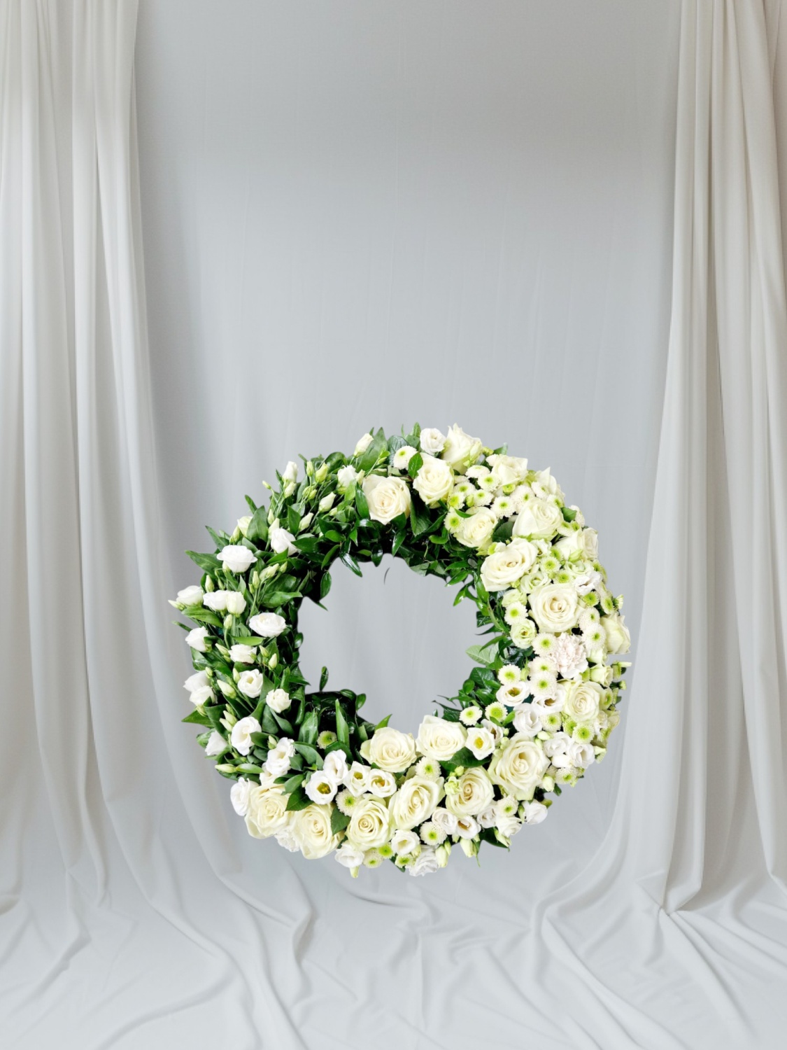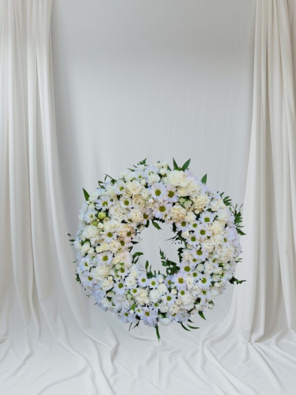 Subtelny i pełen lekkości wieniec rzymski w kształcie koła utrzymany w czystych, jasnych barwach. Białe kwiaty z wyraźnymi akcentami margerytek oraz goździków przywołują skojarzenia z niewinnością, światłem i spokojem. Naturalna forma kompozycji nadaje jej delikatności i świeżości, tworząc wrażenie łagodnego pożegnania. Ten wieniec emanuje ciszą i ukojenie, będąc pięknym symbolem pamięci, zadumy i duchowej bliskości. Istnieje możliwość dołączenia szarfy z indywidualnym napisem kondolencyjnym oraz dodatkowego stelaża na wieniec.