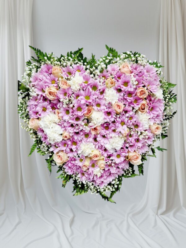 Wieniec pogrzebowy – Serce w jasnych barwach. Wieniec w kształcie serca, utrzymany w stylu rzymskim, symbolizuje miłość, szacunek i głębokie uczucia wobec osoby zmarłej. Kompozycja wypełniona jest starannie dobranymi kwiatami w jasnej, delikatnej kolorystyce: bieli, kremie, jasnym różu i subtelnych odcieniach pastelowych. W centralnej części wieńca dominują: Margarety (margaretki) – symbol niewinności i czystości, wprowadzają świeżość i prostotę. Goździki – znane z długiej trwałości, oznaczają miłość i pamięć; wybrane w jasnych kolorach dodają całości elegancji. Róże – klasyczny znak miłości i wdzięczności, rozmieszczone równomiernie, by podkreślić wyjątkowy charakter wieńca. Gipsówka – delikatne, białe akcenty wypełniają przestrzeń między głównymi kwiatami, nadając lekkości i zwiewności. Całość ułożona jest w formie serca, które wyraża silne emocje – miłość, żal i pamięć o zmarłym. Jasna kolorystyka podkreśla spokój, czystość intencji oraz duchowy wymiar pożegnania. Wieniec może być dodatkowo ozdobiony subtelną wstęgą z dedykacją lub imieniem osoby zmarłej.