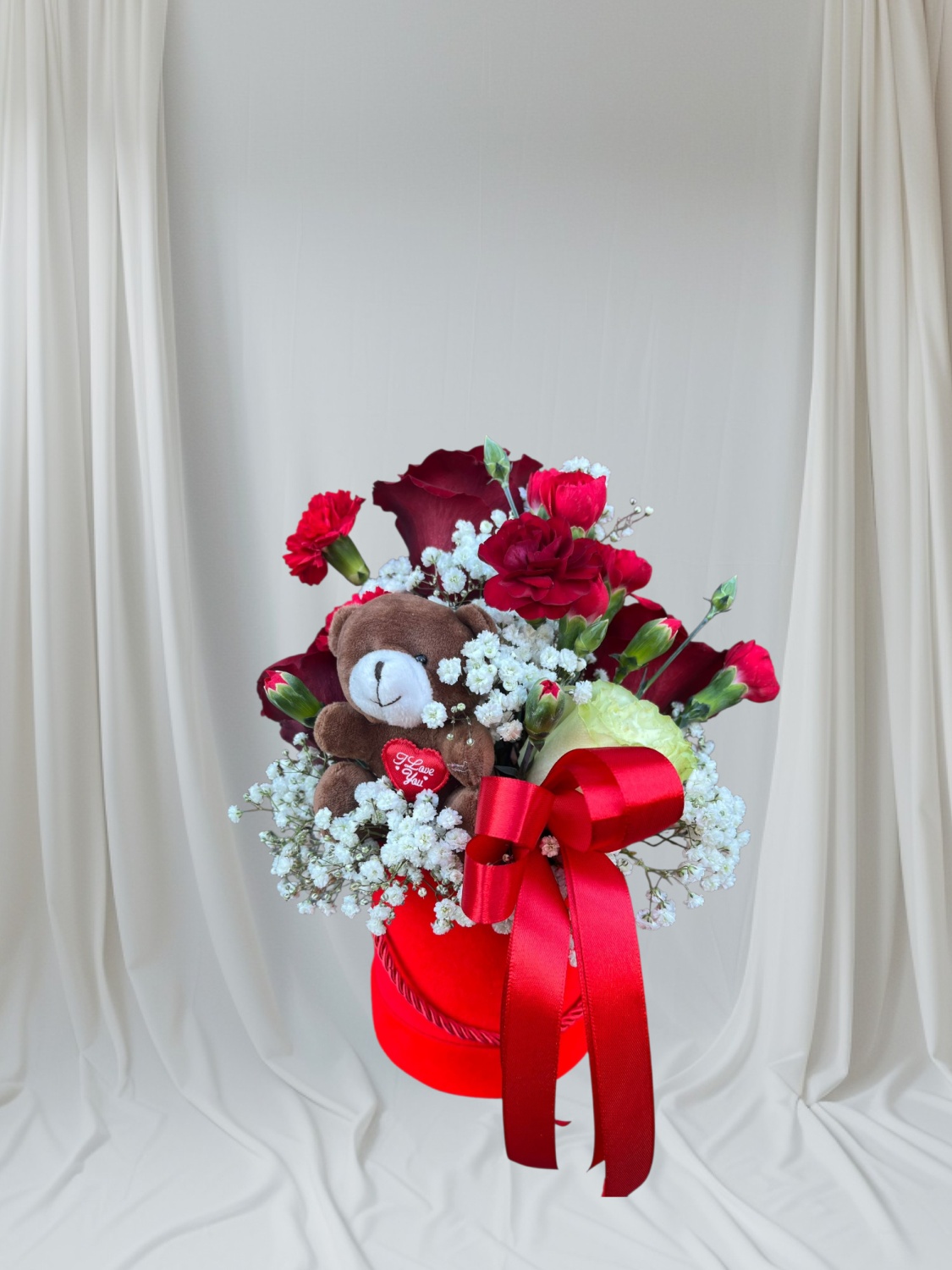 Wyjątkowo luksusowa kompozycja stworzona z myślą o celebracji ważnych chwil. Intensywnie czerwone róże symbolizujące miłość i namiętność zostały uzupełnione wykwintnymi czekoladkami oraz butelką wina, tworząc prezent pełen klasy i zmysłowości. Wszystko umieszczone w eleganckim pudełku, uzupełnione delikatną zielenią i wstążką. Idealny wybór na rocznice, Walentynki lub jako efektowne „wow” bez okazji.