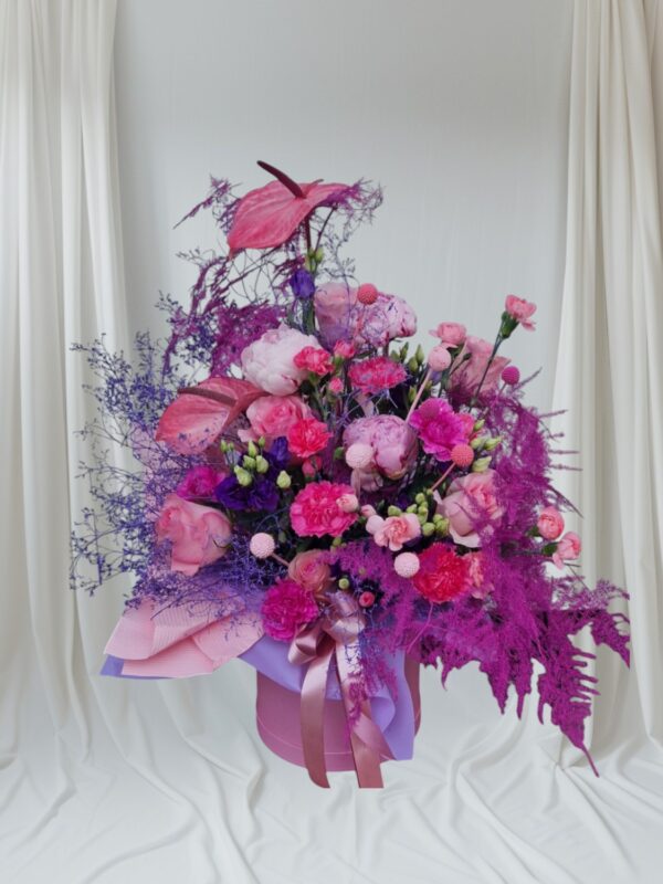 Artystyczny, bogaty flowerbox w odcieniach różu, fioletu i purpury. Połączenie róż, piwonii, goździków, anturium oraz lekkich, eterycznych dodatków gipsówki i plumozusu, które tworzą luksusową i niepowtarzalną kompozycję. Uzupełniony eleganckimi wstążkami i dekoracyjną zielenią, zachwyca lekkością i fantazją. Idealny na wyjątkowe okazje i dla osób ceniących oryginalny styl.