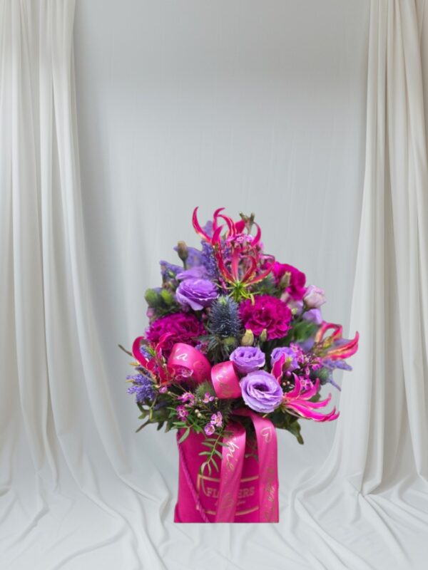 Wyrazista kompozycja pełna energii i koloru, utrzymana w intensywnych odcieniach różu, fuksji i maliny. Różnorodność kwiatów oraz dynamiczne formy nadają całości nowoczesny, odważny charakter. Box składa się z eustomy, goździków, gloriozy, mikołajska oraz cisowych dodatków kwiatowych. Idealny wybór dla osób kochających mocne akcenty i nietuzinkowe florystyczne aranżacje. Doskonały na urodziny, gratulacje lub jako prezent „bez okazji”.
