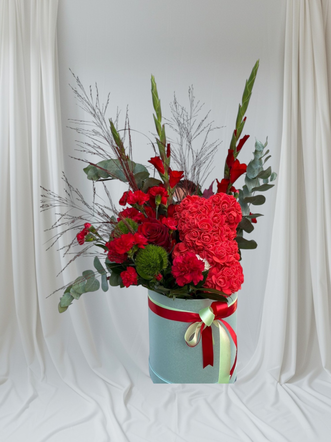 Wyrazisty flowerbox w czerwonej tonacji, który posiada misia z drobnych piankowych różyczek. Dynamiczna kompozycja wzbogacona jest o róże, goździki, mieczyki, eukaliptus i dodatki florystyczne. Całość zamknięta w miętowym pudełku z elegancką wstążką. Doskonały wybór na Walentynki, rocznicę lub odważne wyznanie uczuć.